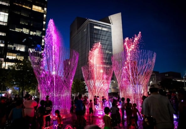 Vitruvian Park wraps hundreds of giant trees in stunning technicolor displays reflected over the water.
